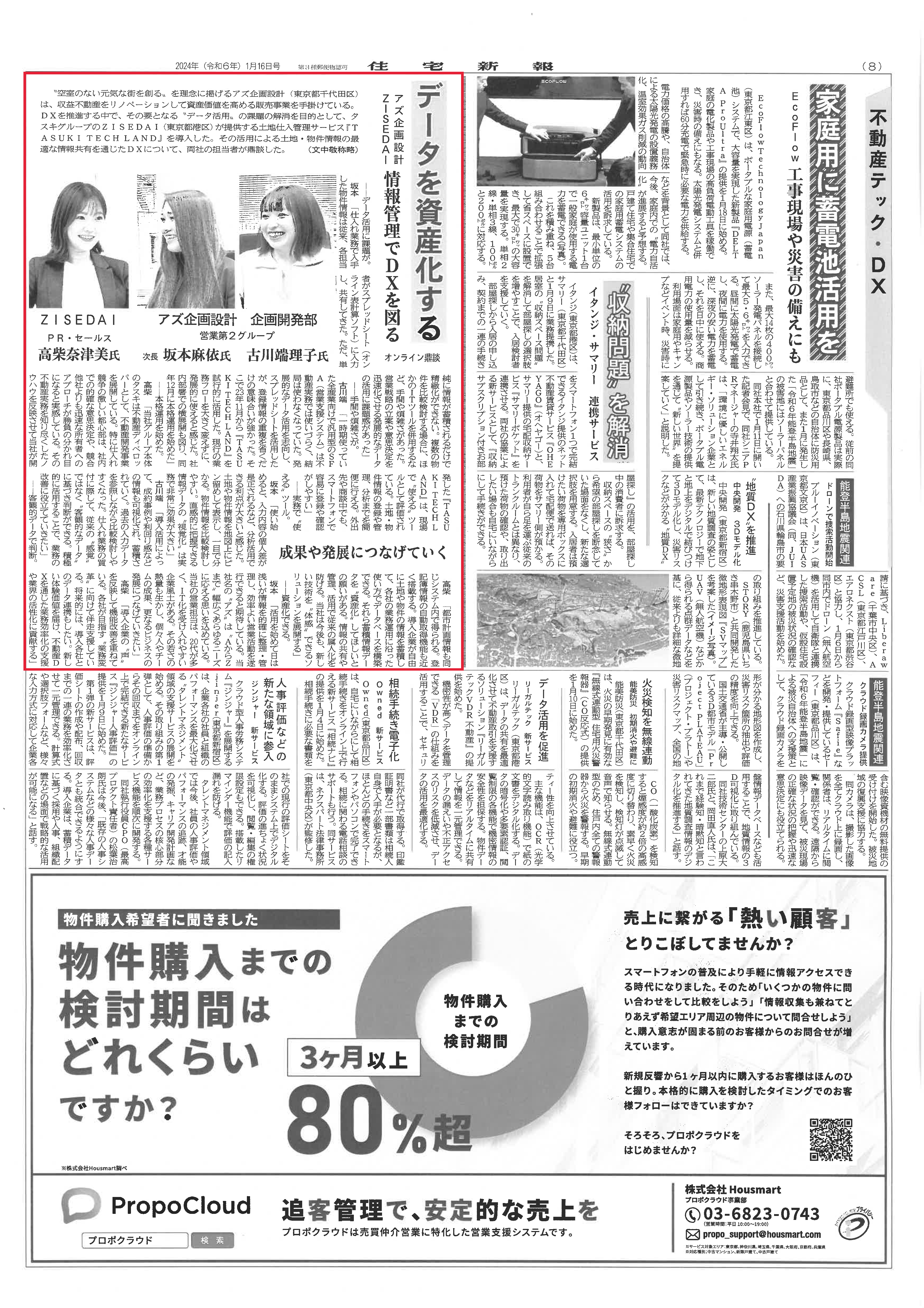 住宅新報(2024年1月16日号)の8面(不動産テック・DX)に、株式会社ZISEDAIの記事が掲載されました。